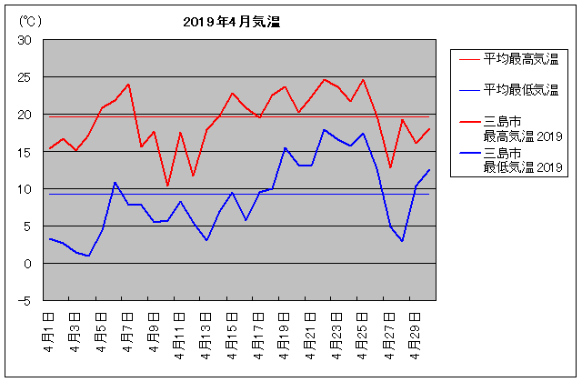 | 月日 | 平均気温 最高 / 最低 | 2019年4月 最高 / 最低 | 降水量 | 月日 | 平均気温 最高 / 最低 | 2019年4月 最高 / 最低 | 降水量 |