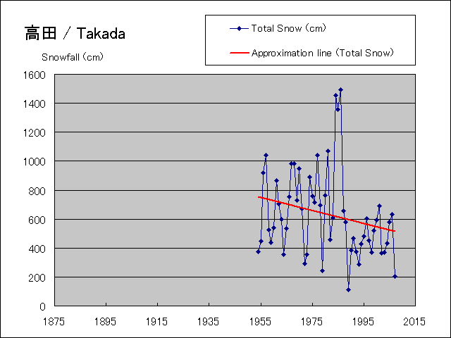 高田の年間降雪量の変化グラフ(1954年から2007年までのデータ)