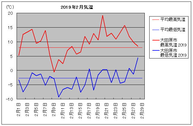 | 月日 | 平均気温 最高 / 最低 | 2019年2月 最高 / 最低 | 降水量 | 月日 | 平均気温 最高 / 最低 | 2019年2月 最高 / 最低 | 降水量 |