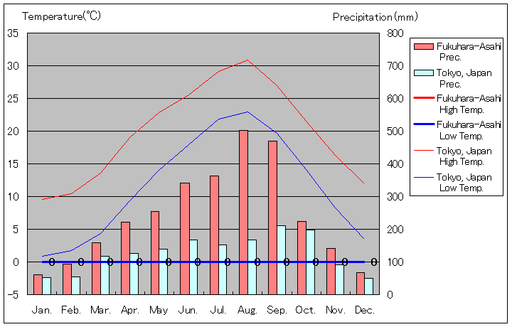 1981年から2010年まで30年間の平均値、徳島県上勝町 福原旭と東京の気温および降水量グラフ