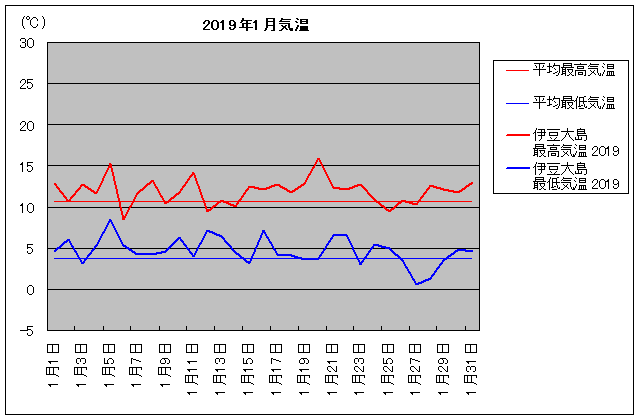 | 月日 | 平均気温 最高 / 最低 | 2019年1月 最高 / 最低 | 降水量 | 月日 | 平均気温 最高 / 最低 | 2019年1月 最高 / 最低 | 降水量 |