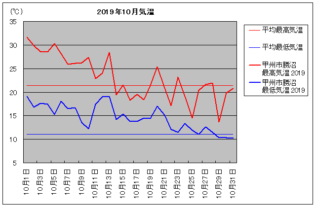 | 月日 | 平均気温 最高 / 最低 | 2019年10月 最高 / 最低 | 降水量 | 月日 | 平均気温 最高 / 最低 | 2019年10月 最高 / 最低 | 降水量 |