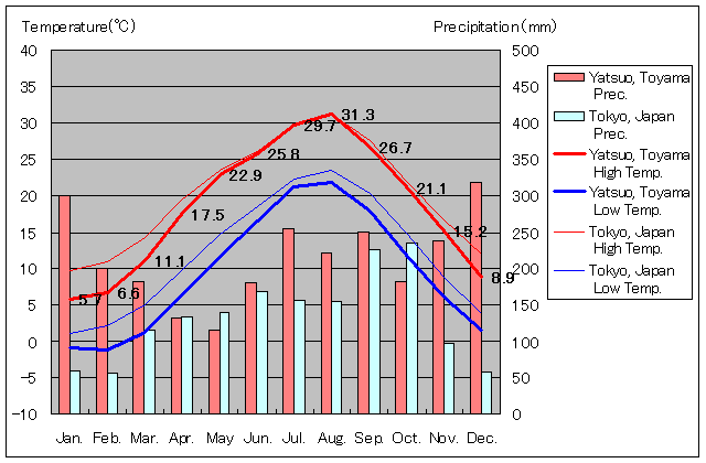 1981年から2010年まで30年間の平均値、富山市八尾と東京の気温および降水量グラフ