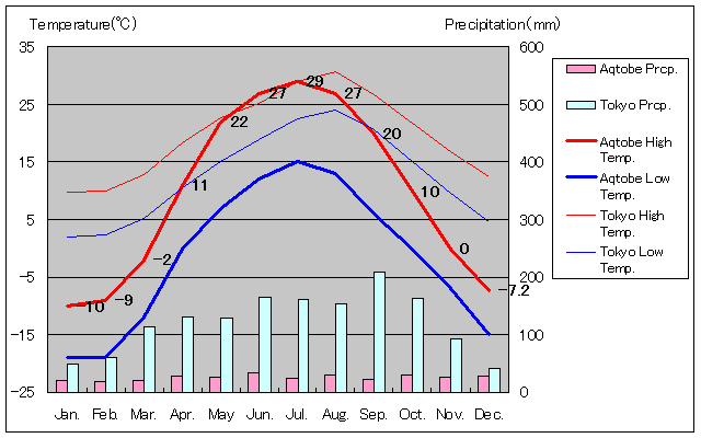 アクトベ州アクトベ月別気温(Temperature & Precipitation of Aqtobe, Aqtobe Region, Kazakhstan):アクトベ州の州都、カザフスタン第5の都市、人口 560,820人(2020年1月1日現在)、都市圏人口 750,000人(2020年1月1日現在)