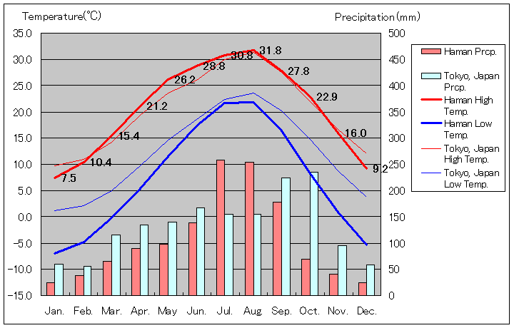 咸安(ハマン)と東京の気温および降水量グラフ(1993年から2020年までの平均値)