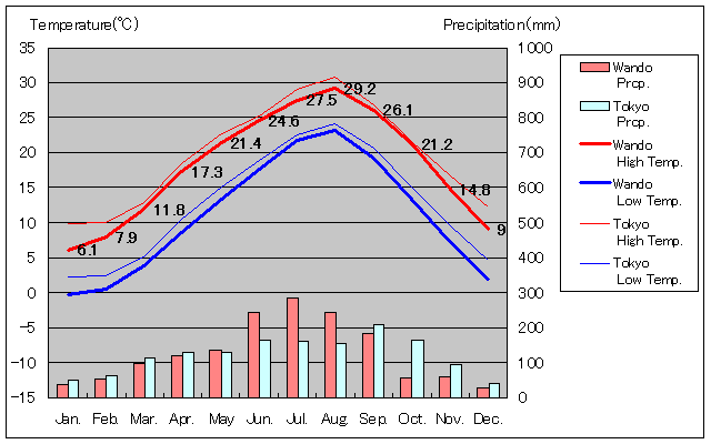 韓国南西部(光州から南へ 95キロメートル)の多島海にある莞島(ワンド)の気候は、暖かで湿潤な亜熱帯気候の一つである温暖湿潤気候(ケッペン気候区分:Cfa)に属し、夏は暑くなり南東モンスーンにより雨が多く降ります。冬は寒くなるもの海洋の保温効果により、緯度から想像するほど寒くはなりません。莞島の気温と降水は、年間平均気温は 14.4℃、年間降水量 1,533ミリメートルです。1年で最も雨が降るのは 7月(月間降水量 285ミリメートル)、雨が最も少なく乾燥するのは 12月(月間降水量 27ミリメートル)です。