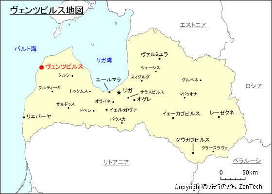 ヴェンツピルスの年間平均気温 6.4℃、年間平均最高気温 9.3℃、年間平均最低気温 3.5℃、年間降水量 691ミリメートル、ラトビア環境・地質・気象センター(Latvian Environment, Geology and Meteorology Centre)データ