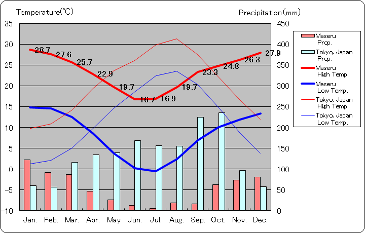 マセルと東京の気温と降水量グラフ(1981年から2010年までの平均値)