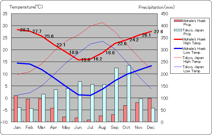 モハレス・フークと東京の気温と降水量グラフ(1981年から2010年までの平均値)