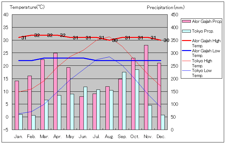 アロー・ガジャと東京の気温および降水量グラフ