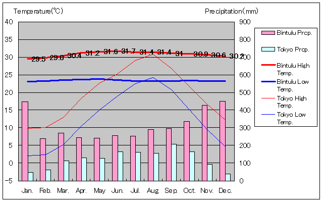 1961年から1990年、ビントゥルと東京の気温および降水量グラフ