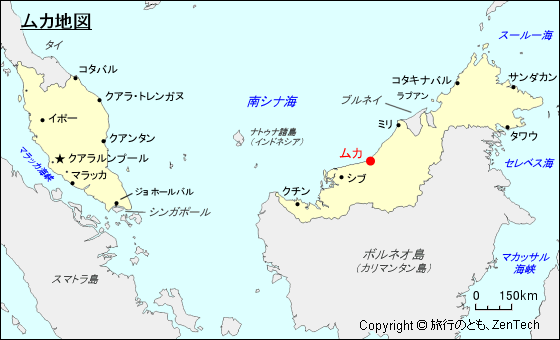 マレーシアのボルネオ島北西部、サラワク州中西部沿岸(クチンから北東へ 245キロメートル)に位置するムカの気候は、ボルネオ島の多くの地域と同様に熱帯雨林気候(ケッペン気候区分:Af)に属し、一年を通して暑く雨がかなり多く、高温多湿なことが特徴です。年間で最も雨が降るのは1月で月間降雨量が 586ミリメートルもの大量の雨が降り、最も雨が少なくなる 7月でも165ミリメートルの雨が降ります。ムカの気温と降水は、年間平均気温 26.9℃、年間平均最高気温 31.2℃、年間平均最低気温 22.7℃、年間降雨量 3,581ミリメートルです。