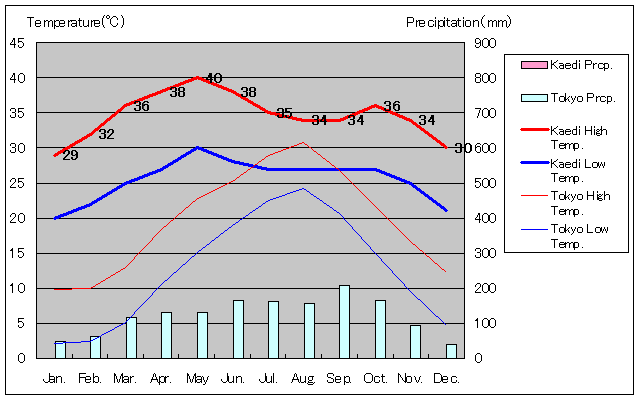 カエディと東京の気温および降水量グラフ