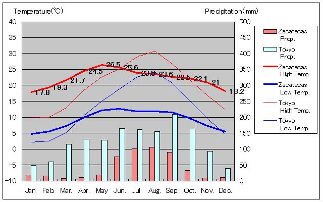 サカテカス・シティと東京の気温および降水量グラフ(1951年から2010年までの平均値)
