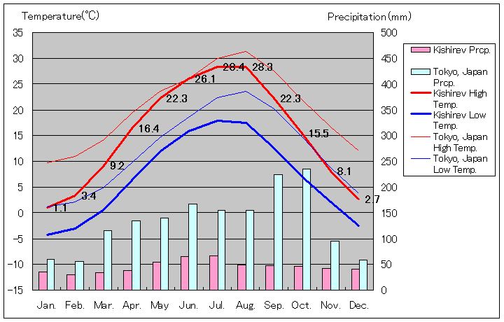 1981年~2010年、キシナウと東京の気温と降水量グラフ