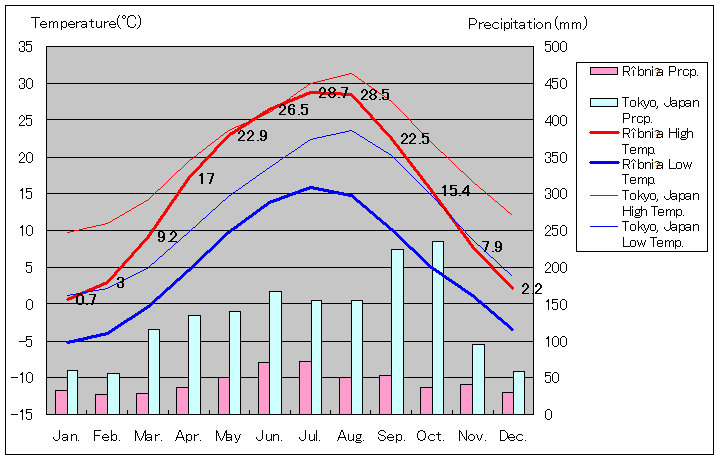 ルィブニツァと東京の気温および降水量グラフ(1991年から2020年までの平均値)
