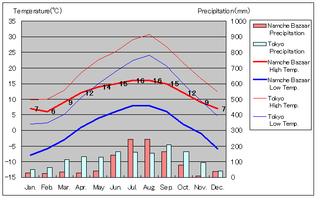 ナムチェ村と東京の気温および降水量グラフ