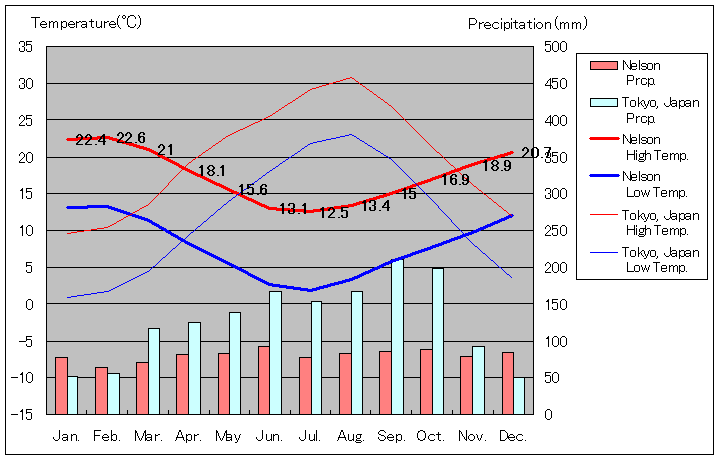 ニュージーランド南島ネルソン地方ネルソン月別気温(Temperature & Precipitation of Nelson, Nelson Region, South Island, New Zealand):ネルソン地方の中心都市、人口 52,400人(2018年6月現在)