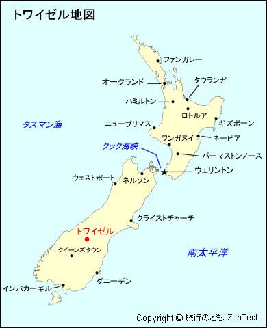 ニュージーランドにおけるトワイゼルの場所が判る地図