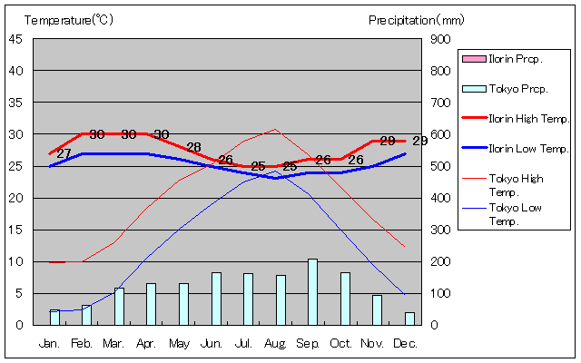クワラ州イロリン月別気温(Temperature & Precipitation of Ilorin, Kwara State, Nigeria):クワラ州の州都となっている都市、人口 777,667人(2006年現在)、人口 908,490人(2011年推計)、イロリン都市圏人口 150万人、ナイジェリアで7番目に人口の多い街です。