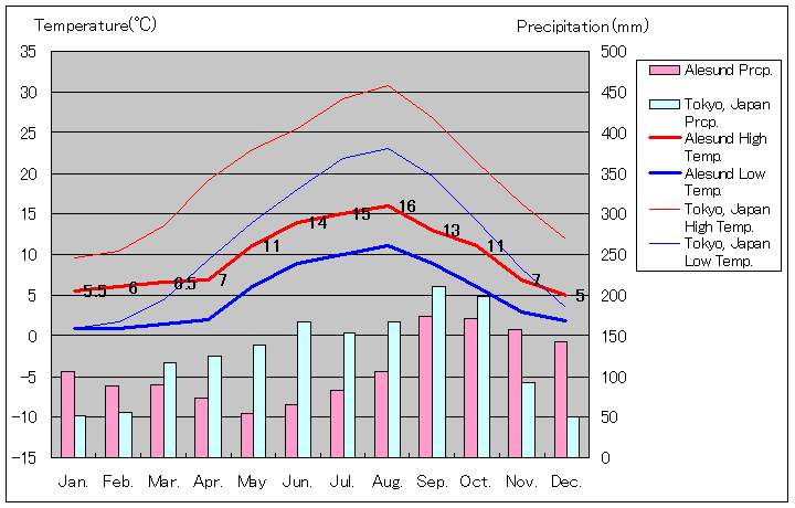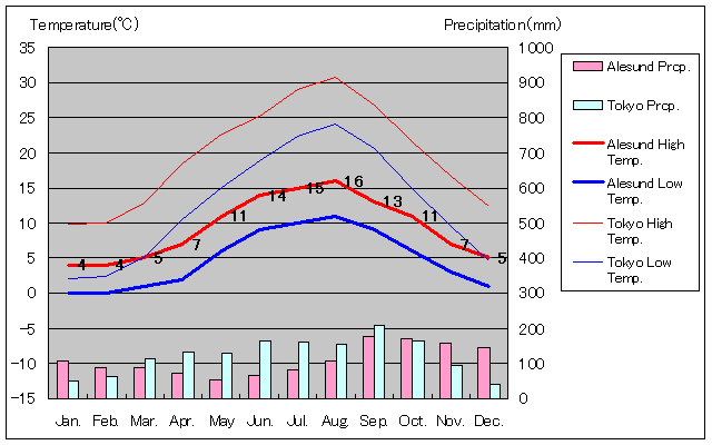 西部地域(ヴェストラン)ムーレ・オ・ロムスダール県オーレスン月別気温(Temperature & Precipitation of Alesund (Ålesund), Møre og Romsdal County, Vestlandet and Central Norway, Norway):ノルウェー第9の都市、人口 52,626人(2018年現在)