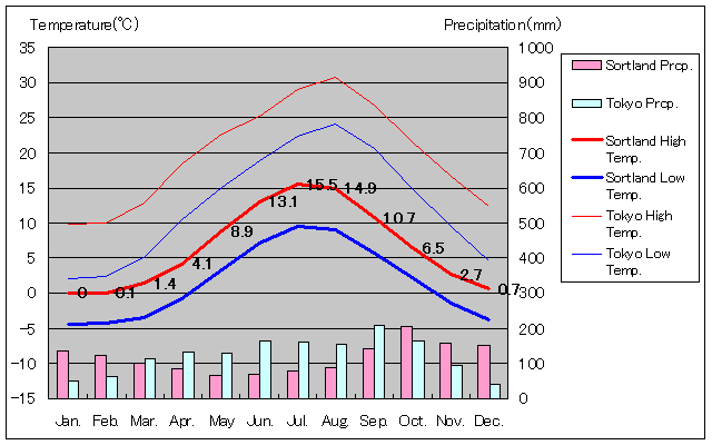 | 平均最高気温(℃) | 0 | 0.1 | 1.4 | 4.1 | 8.9 | 13.1 | 15.5 | 14.9 | 10.7 | 6.5 | 2.7 | 0.7 |