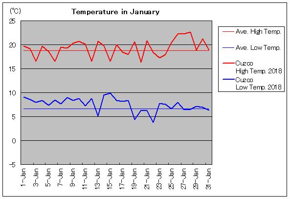| 月日 | 平均気温 最高 / 最低 | 2018年1月 最高 / 最低 | 降水量 | 月日 | 平均気温 最高 / 最低 | 2018年1月 最高 / 最低 | 降水量 |