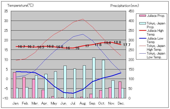 プーノ県フリアカ月別気温(Temperature & Precipitation of Juliaca, Puno Region, Peru):プーノ県の最大都市、人口 276,110人(2017年現在)、ペルーで 11番目に人口の多い街です。チチカカ湖西岸から西へ約25キロメートルの場所にある都市です。