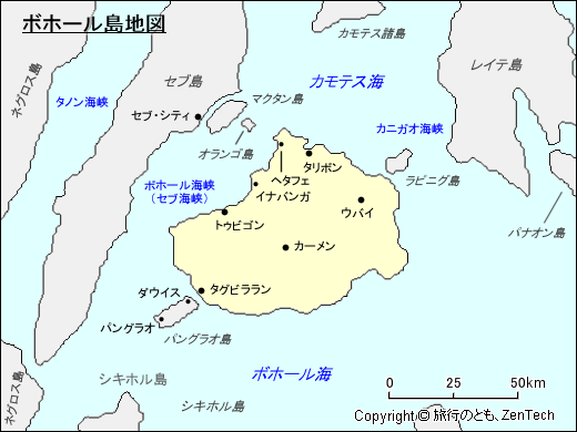 ボホール島は、面積 4,821平方キロメートル(1,861平方マイル)、海岸線の長さ 261キロメートル(162マイル)で、フィリピンで 10番目に大きい島です。本島は 70ほどの小さな島々に囲まれており、そのうち最大の島は南西のタグビラランに面するパングラオ島と北東のラピニグ島です。