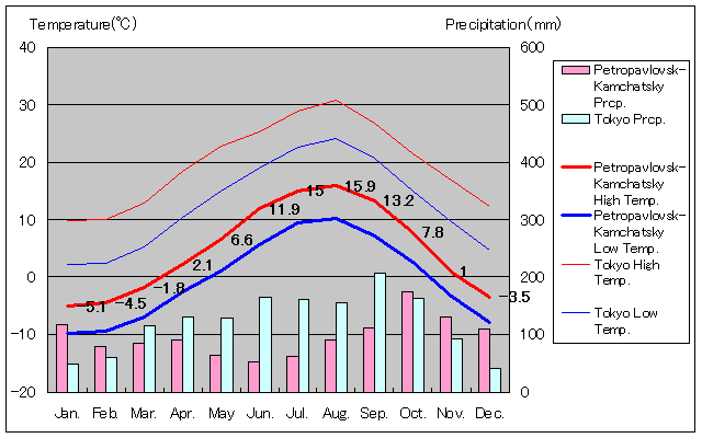 ペトロパブロフスク・カムチャツキーと東京の気温および降水量グラフ