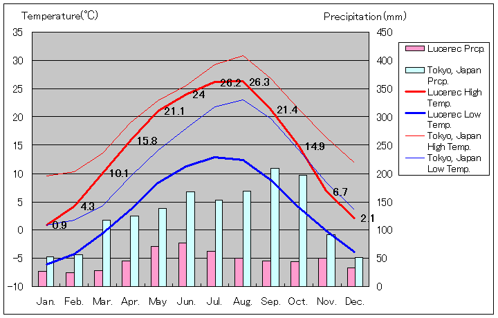| 平均最低気温(℃) | -6 | -4.3 | -0.6 | 3.5 | 8.3 | 11.3 | 12.8 | 12.4 | 8.8 | 4.1 | -0.2 | -3.9 |