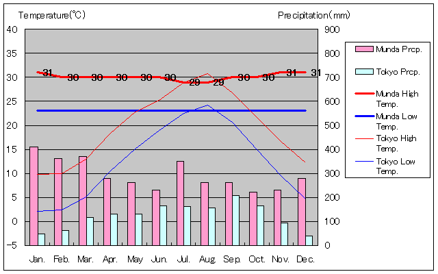 ムンダと東京の気温および降水量グラフ