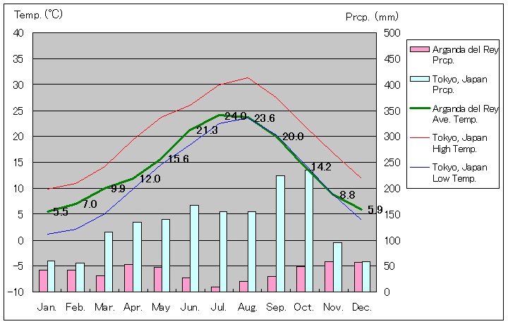 マドリード州マドリード県アルガンダ・デル・レイと東京の気温および降水量グラフ(1972年から2003年までの平均値)