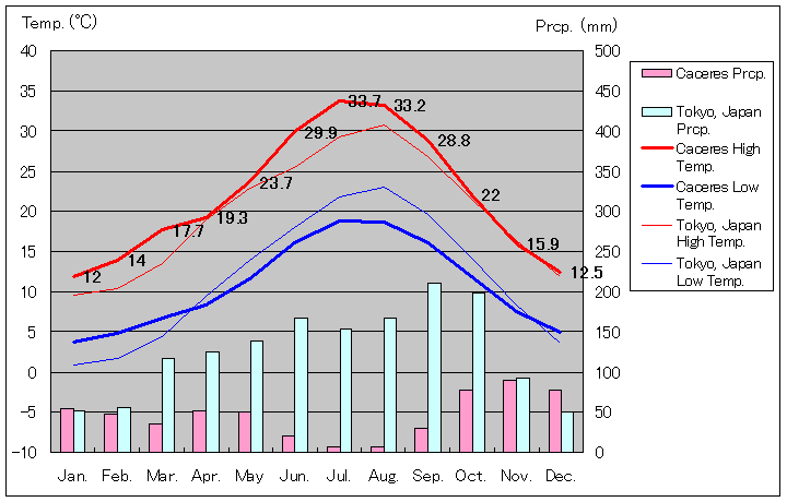 1982年~2010年、カセレス県カセレスと東京の気温および降水量グラフ