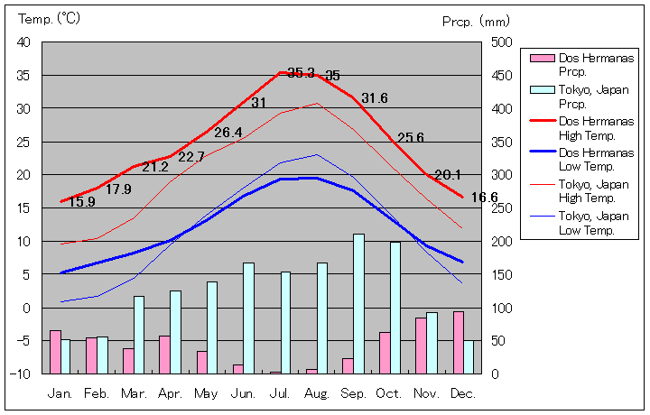アンダルシア州セビリア県ドス・エルマーナスと東京の気温および降水量グラフ