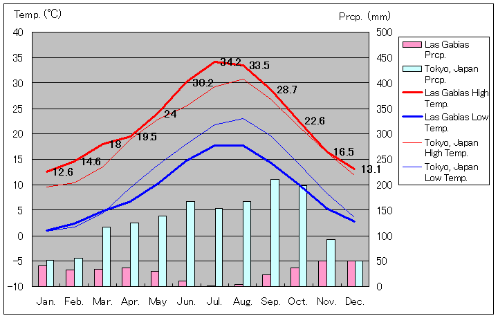 アンダルシア州グラナダ県ラス・ガビアスと東京の気温および降水量グラフ