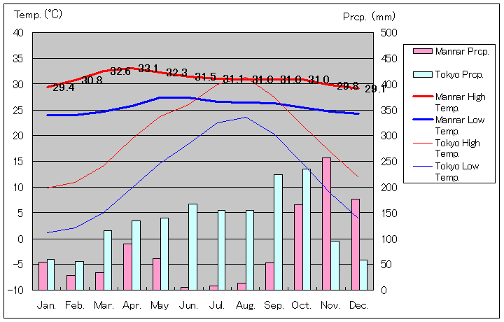 マンナールと東京の気温と降水量グラフ