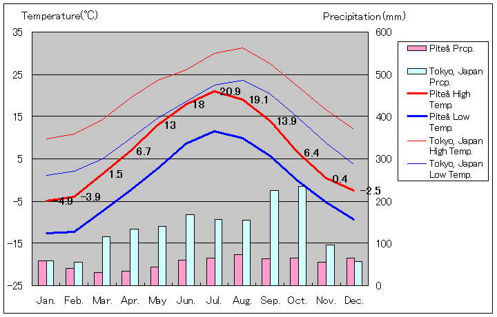 ノールボッテン県ピーテオ月別気温(Temperature & Precipitation of Piteå, Norrbotten County, Sweden)