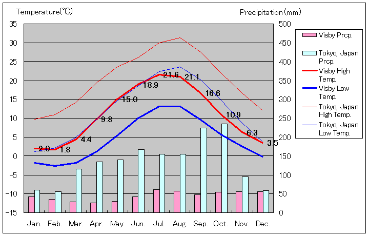 ゴットランド県ビスビュー月別気温(Temperature & Precipitation of Visby, Gotland County, Sweden)