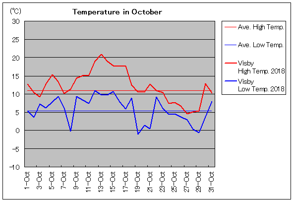 | 10月4日 | 10.9 / 5.4 | 12.7 / 6.1 | 0 | 10月19日 | 10.9 / 5.4 | 10.5 / -1.0 | 0 |