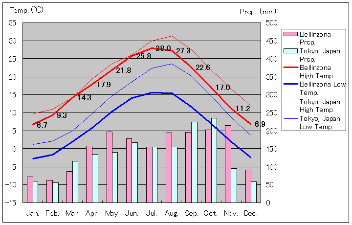 ティチーノ州ベリンツォナと東京の気温および降水量グラフ(1991年から2020年までの平均値)