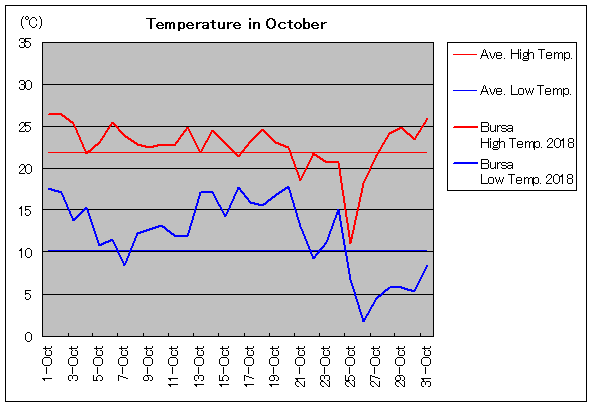 | 10月1日 | 21.9 / 10.1 | 26.5 / 17.6 | 2 | 10月16日 | 21.9 / 10.1 | 21.5 / 17.7 | 0 |