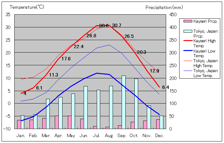 カイセリの年間平均気温 10.4℃、年間平均最高気温 18.0℃、年間平均最低気温 2.9℃、年間降水量 384ミリメートル、年間降水日数 105日、年間日射時間 2,540.9時間、1931年から2017年まで87年間の平均値、トルコ気象局(Turkish State Meteorological Service)データ