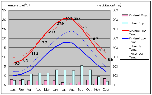 クルクラーレリ月別気温(Temperature & Precipitation of Kirklareli, Kirklareli Province, Marmara Region, Turkey)