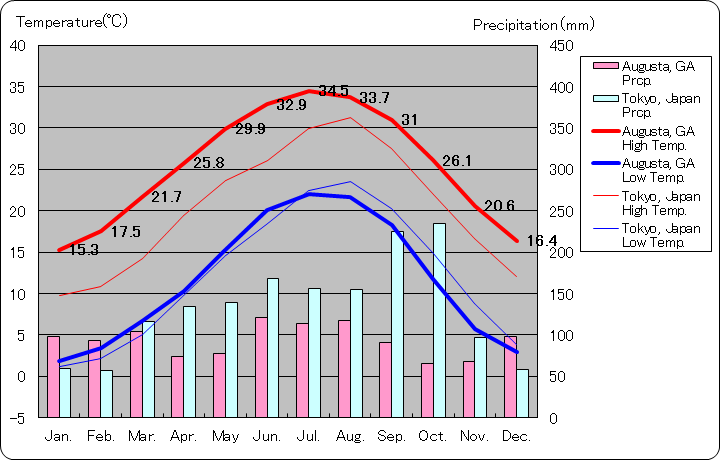 ジョージア州オーガスタと東京の気温および降水量グラフ