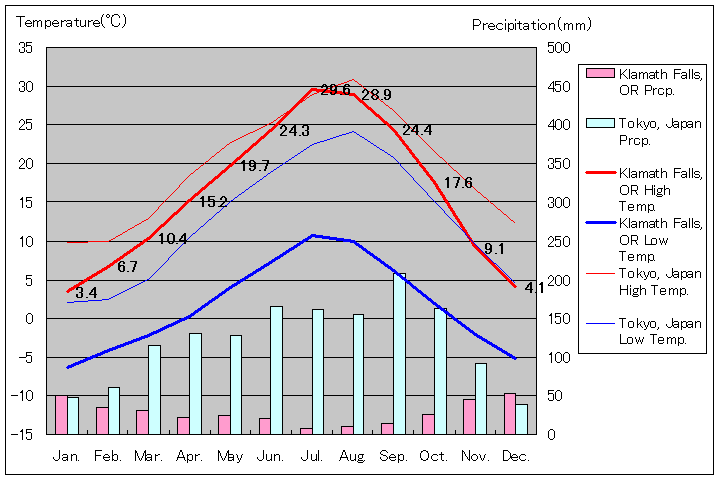アメリカ合衆国オレゴン州クラマス・フォールズと東京の気温および降水量グラフ