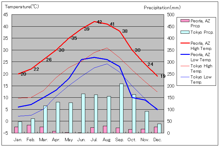 アメリカ合衆国アリゾナ州ピオリアと東京の気温および降水量グラフ