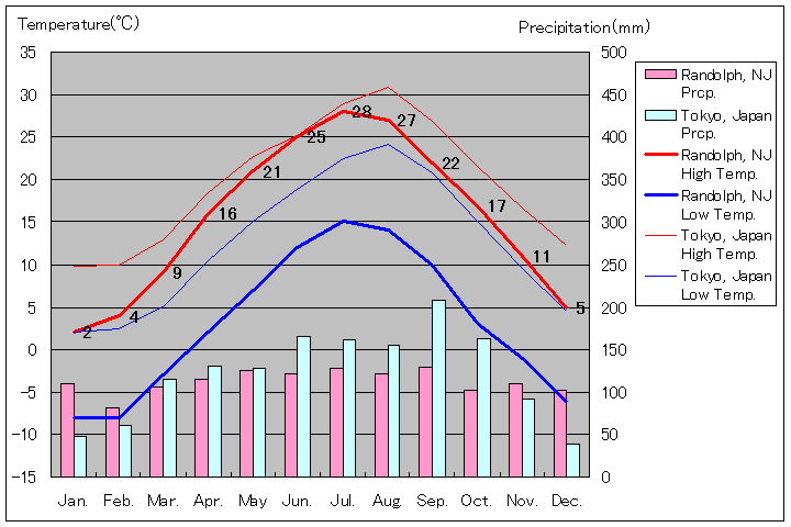 アメリカ合衆国ニュージャージー州ランドルフと東京の気温および降水量グラフ