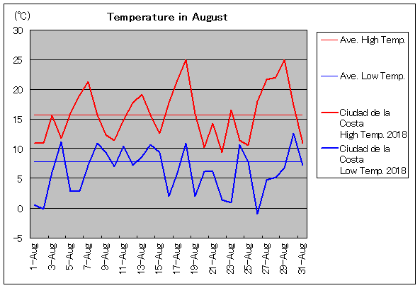 | 8月11日 | 15.7 / 7.8 | 14.8 / 10.4 | 0 | 8月26日 | 15.7 / 7.8 | 18.0 / -1.0 | 0 |