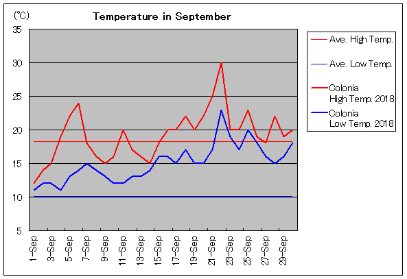| 9月4日 | 18.2 / 10.1 | 19.0 / 11.0 | 0 | 9月19日 | 18.2 / 10.1 | 20.0 / 15.0 | 11 |